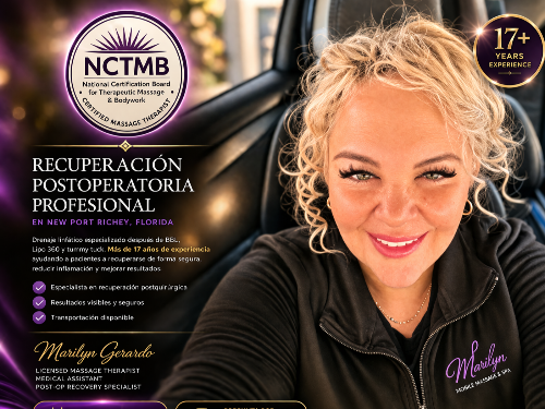 Marilyn Gerardo LMT, NCTMB, RMA is a Specialist in Medical massage in Hernando and Pasco area FL. She is affiliated with the National Board of Massage and Florida Health. Her company accepts new clients and offers services from the comfort of your home. Marilyn Mobile Massage it's an independent company that provides services from the comfort of your home, and we are proud to be the favorite option of our clients since in this way their recovery is faster and more pleasant. At Marilyn Mobile ...